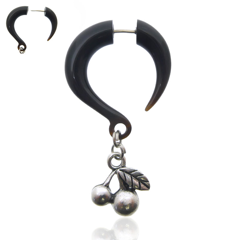 Piercing faux écarteur en corne de buffle naturelle avec motif cerises en argent.