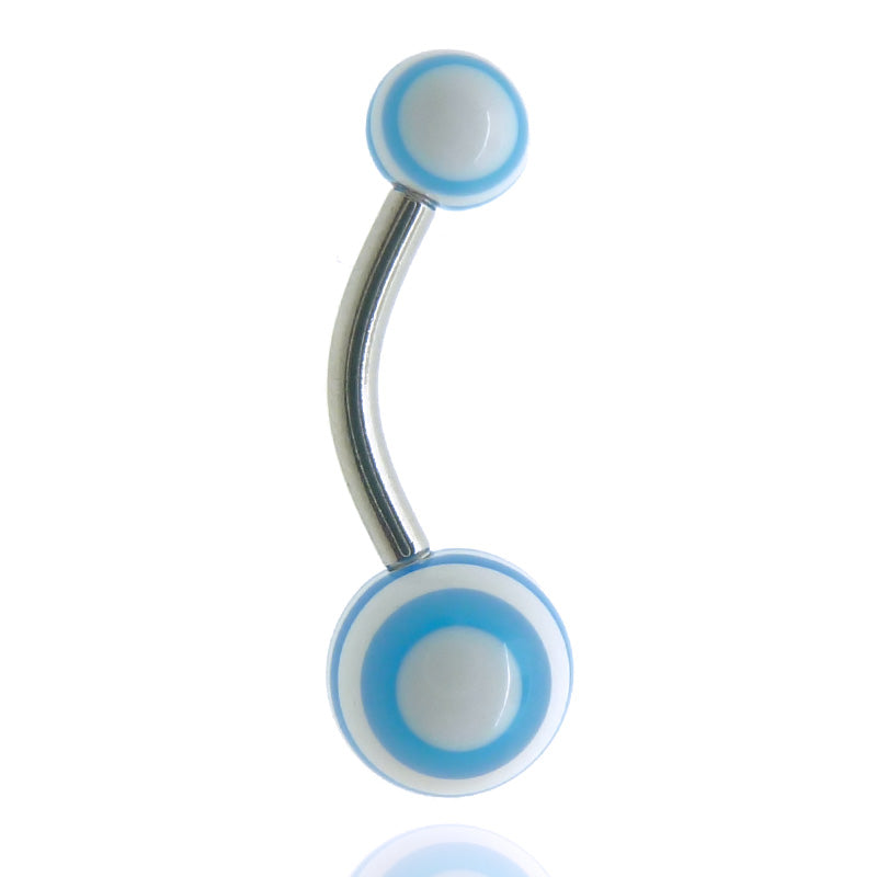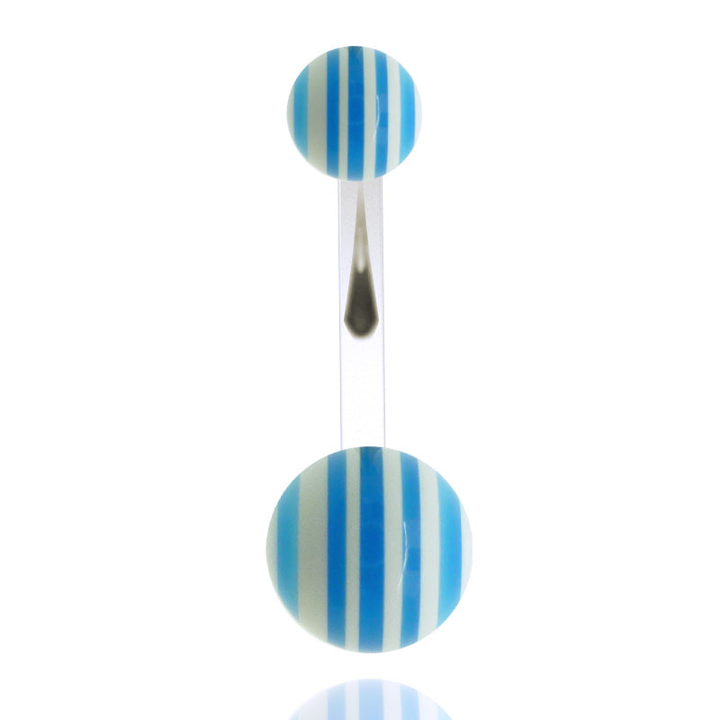 Piercing de nombril en acrylique rayé bleu et blanc avec barre en acier chirurgical.