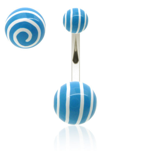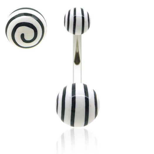 Piercing nombril avec boules acrylique décorée d'une spirale noire ou blanche avec barre en acier chirurgical.