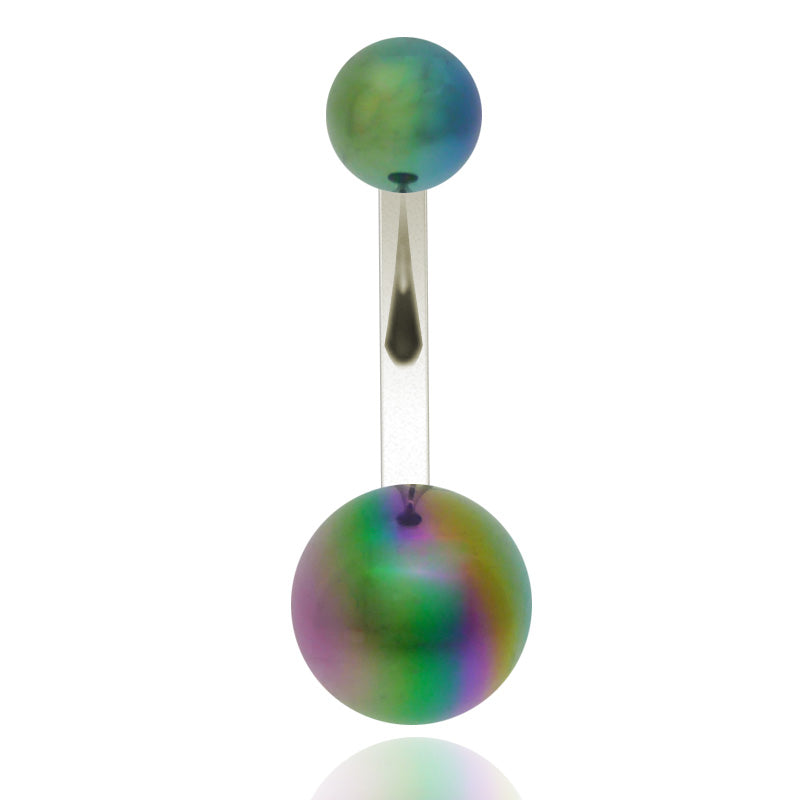 Piercing de nombril en acrylique effet nacré avec barre en acier chirurgical.
