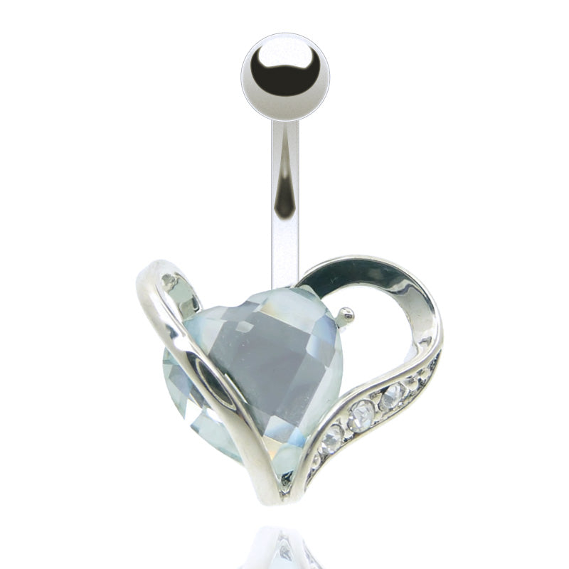Bijou de nombril avec motif cœur et brillants blancs avec barre et boule en acier chirurgical.