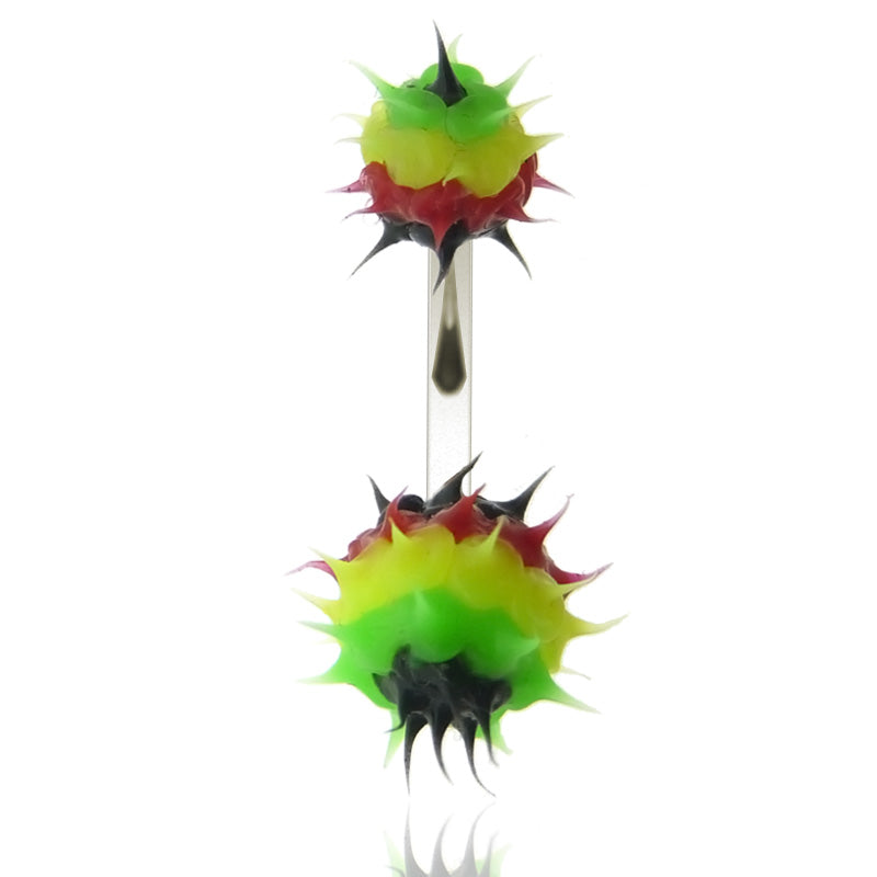 Piercing nombril acier chirurgical avec boules rasta (vert, jaune et rouge) en silicone.