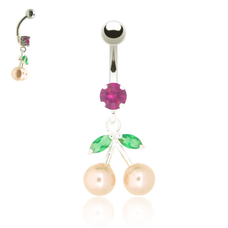 Piercing de nombril pendentif avec cerises nacrées en argent.