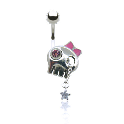 Piercing nombril pendentif avec une tête argent (nœud papillon rose) et une chainette argent avec un brillant mauve griffé.