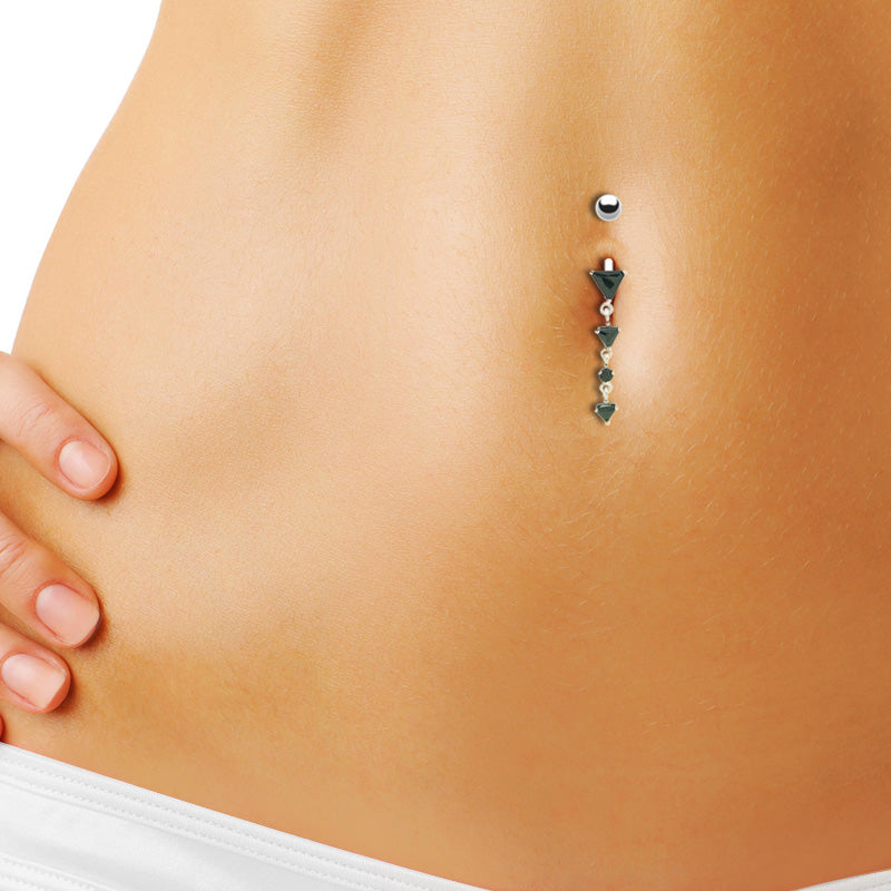 Piercing pendentif pour le nombril avec oxydes de zirconium en forme de triangles.